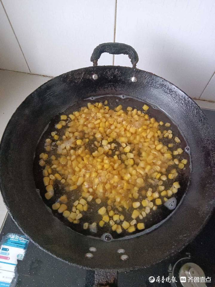 2、锅内放水,然后放入玉米粒,开火煮熟;