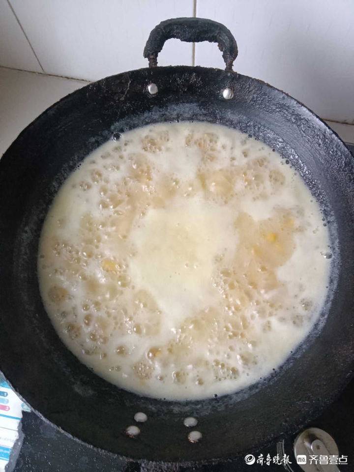 4、玉米粒煮熟后,再向锅内倒入调好的玉米面;