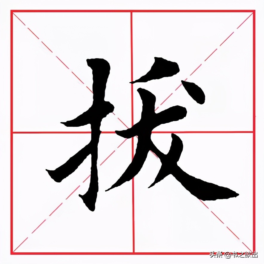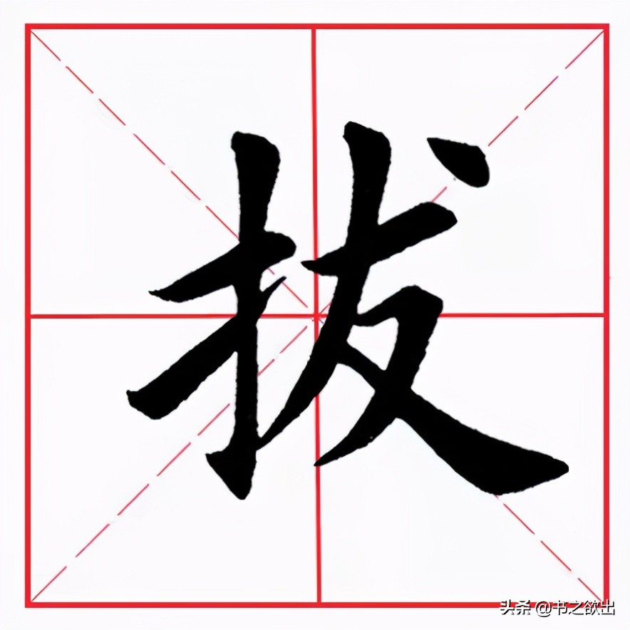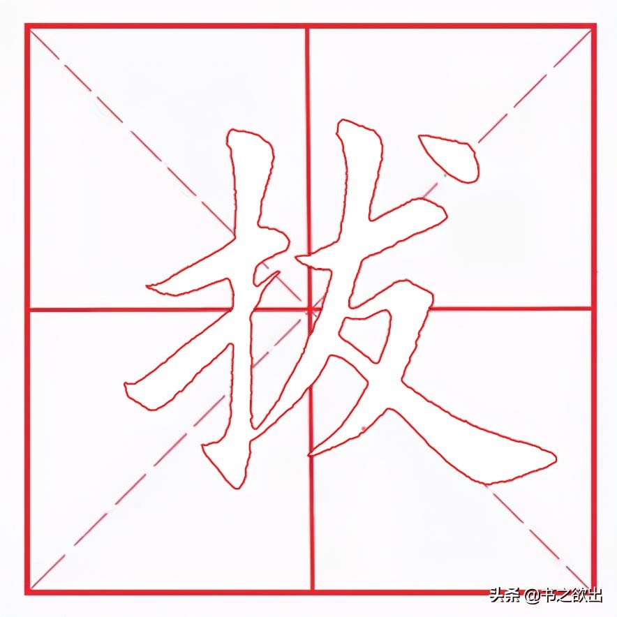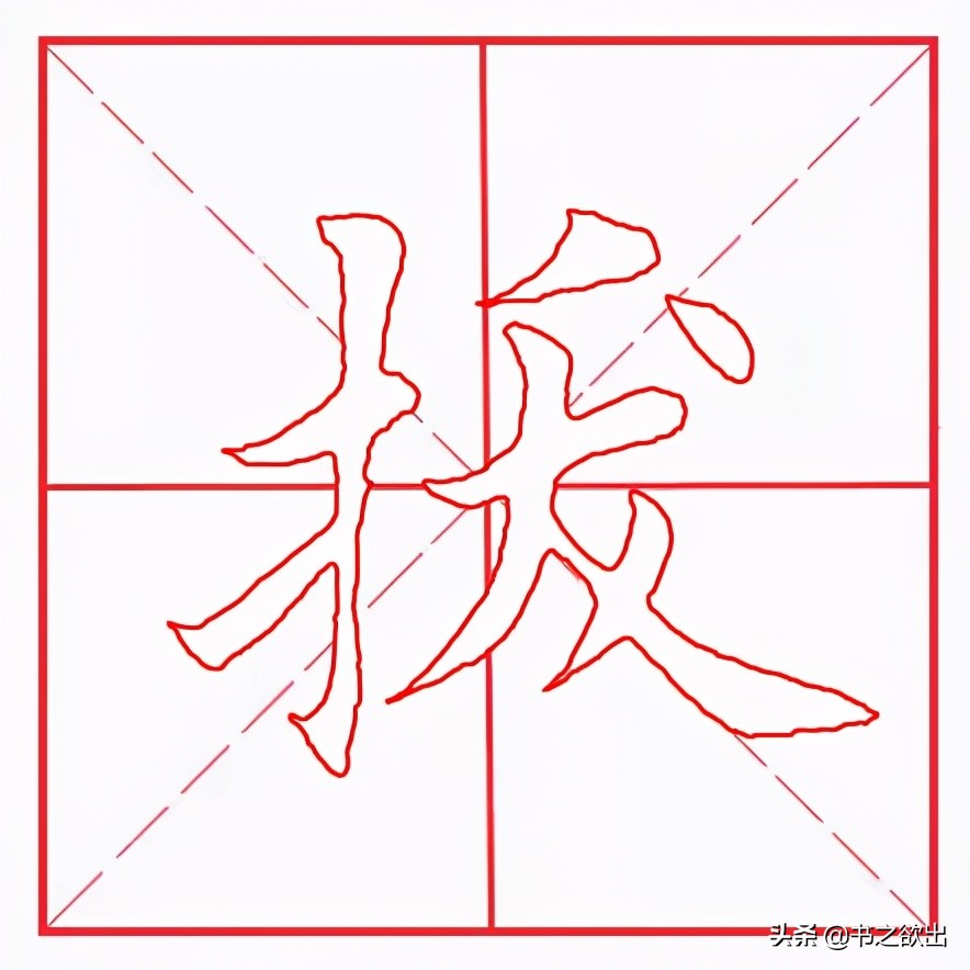 右边撇画落笔先向右,随即转锋向左快速撇出,短促有力,角度稍平;横画起笔稍左探,向右大抗肩,右部勿长;竖撇稍重,先竖后撇,过横画后稍带弯度快速向左下撇出;捺笔从撇画里面起笔,顺势向右下行,渐重,到捺角处笔锋稍顿然后向右缓提笔锋平出,捺角略低;小撇起笔不要超过横画,撇身稍直;最后点笔勿重,注意角度。