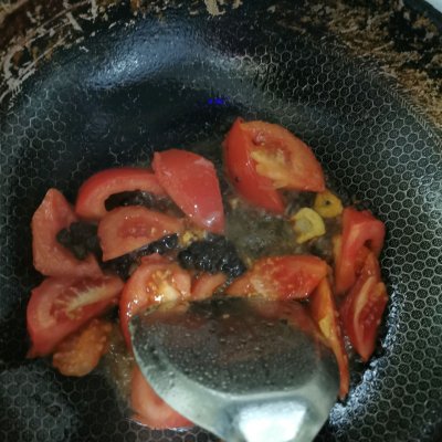 3、放入西红柿炒出红油。加入适量豆豉翻炒。