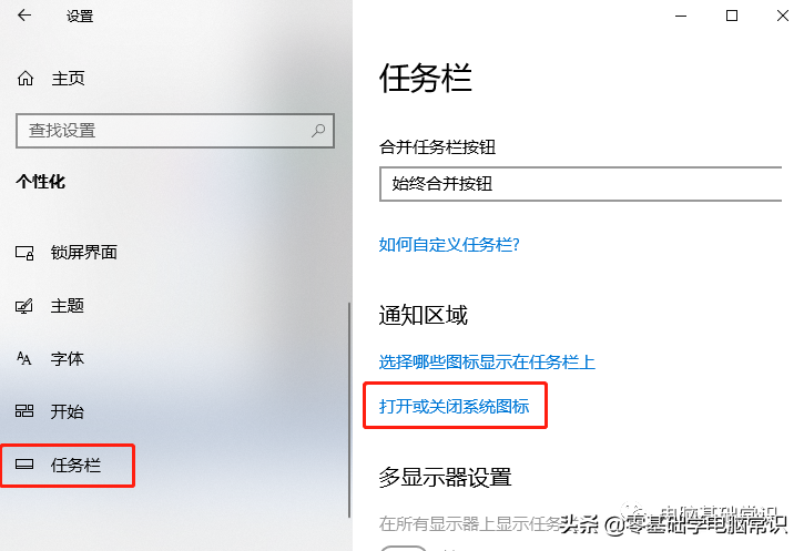 2. 然后,在“个性化”窗口中,选择左侧的“任务栏”,找到右侧的“打开或关闭系统图标”,点击。