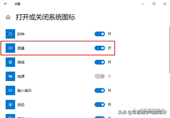 3.接下来,在弹出的“打开或关闭系统图标”窗口中,找到并点击打开“音量”。