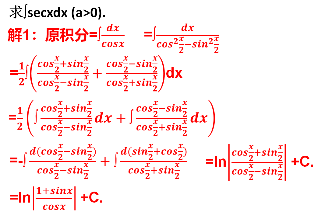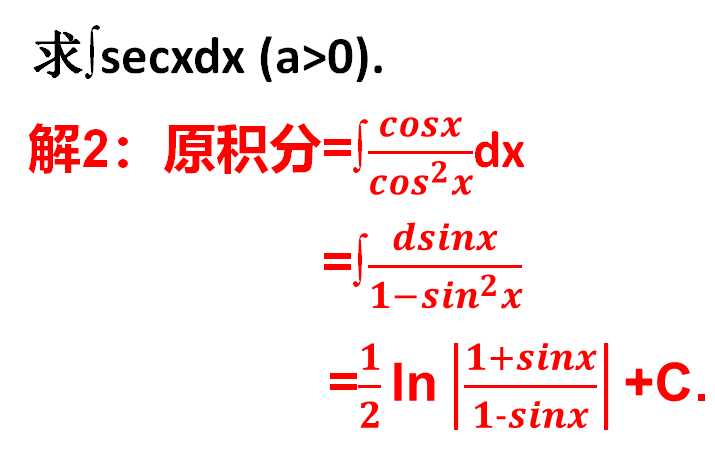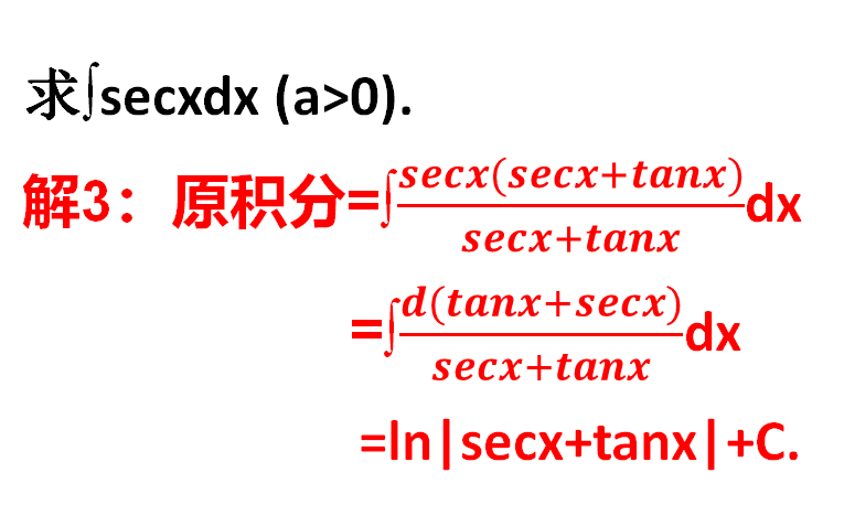 比如正割函数的不定积分,就至少可以用三种方法,求出三种形式。为了让大家感受后两种解法的强大功能,老黄决定先从最繁的方法解起。