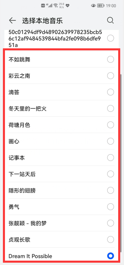 然后,我们可以在这个音乐列表中,选择任何一首自己喜欢的歌曲,作为微信语音通话和视频通话的铃声。如上图所示,我选择了“Dream it Possible”,这样设置完成后,再有微信语音通话或视频通话时,来电铃声就会变成“Dream it Possible”这首歌曲了。