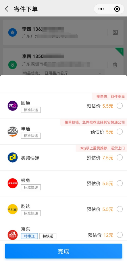 4、选中快递之后,直接下单等收派员上门取件即可。