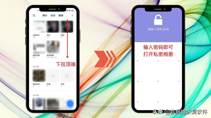 第2步:随后在“相册”界面的顶部下拉,这时就会将隐藏起来的私密相册给打开了,用密码解锁后即可进入;