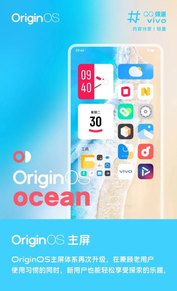 同时,vivo 官方 QQ 频道也公布了新系统的桌面设计风格。通过海报可得知:新主屏将融合 1.0 版本的双桌面。