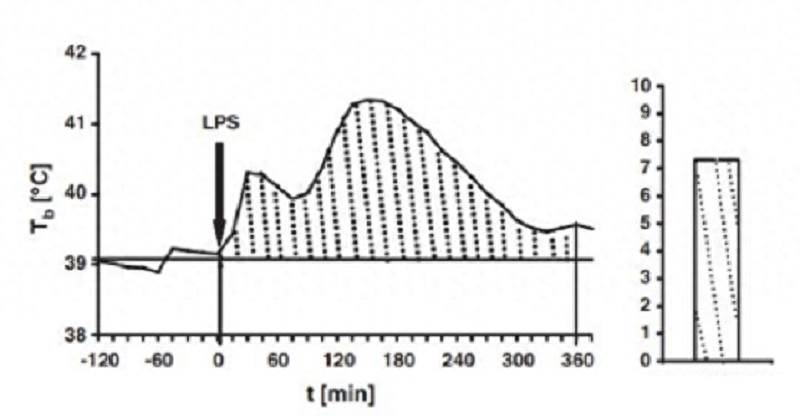 下图所示就是给实验动物注射细菌脂多糖诱发发烧体温变化曲线,尽管没有给任何退烧药,数小时后体温依旧自行下降到接近注射前的水平。