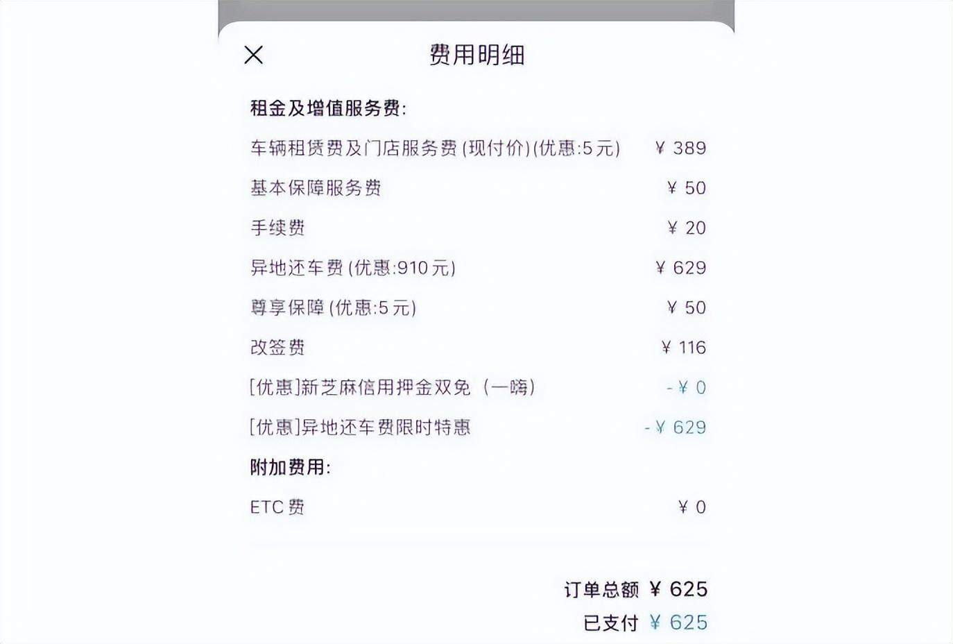 当地店员告诉李青,全部门店都没有车了,无法提供新车,建议提前还车。总价625元,包括一项“改签费”。
