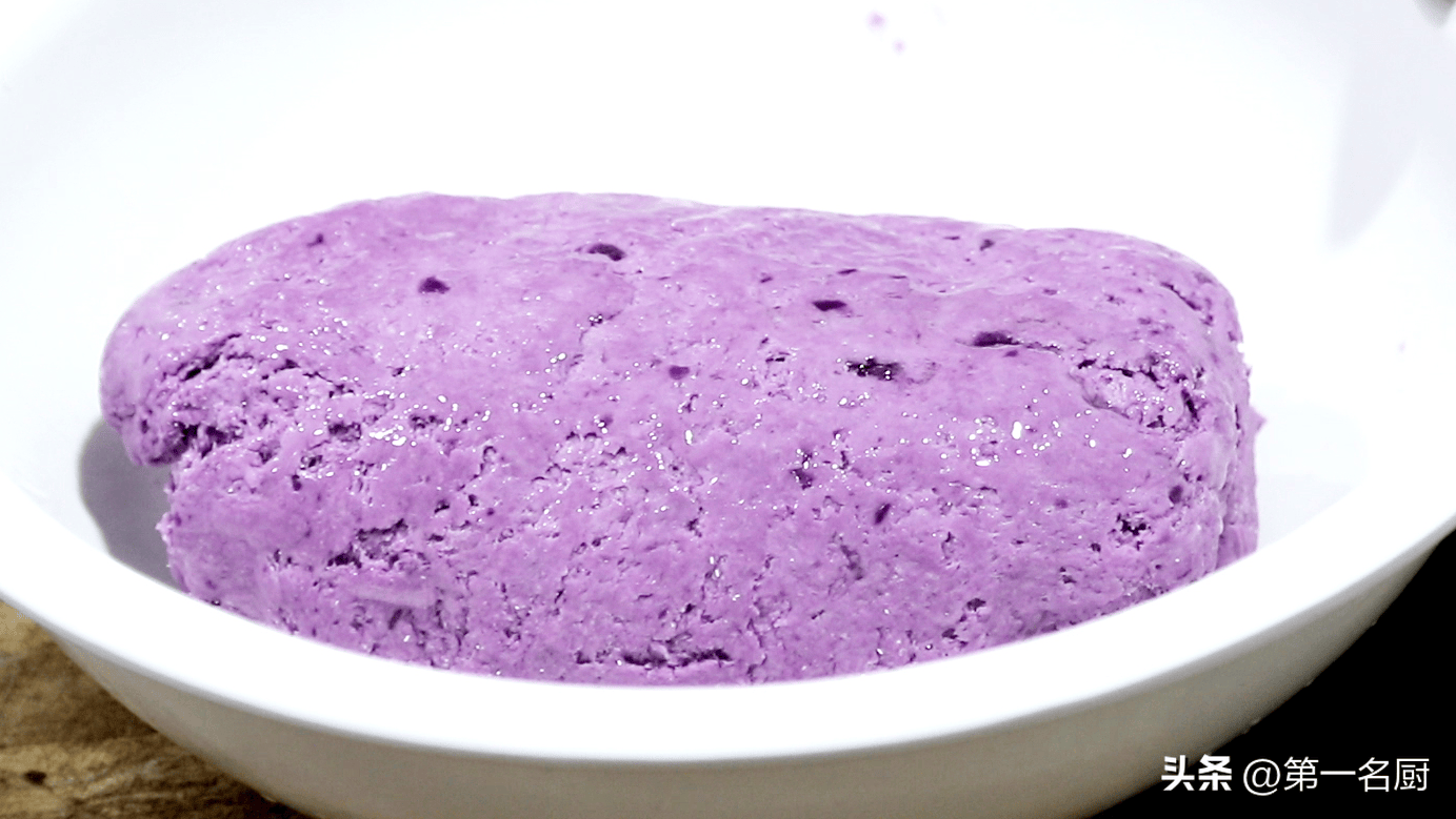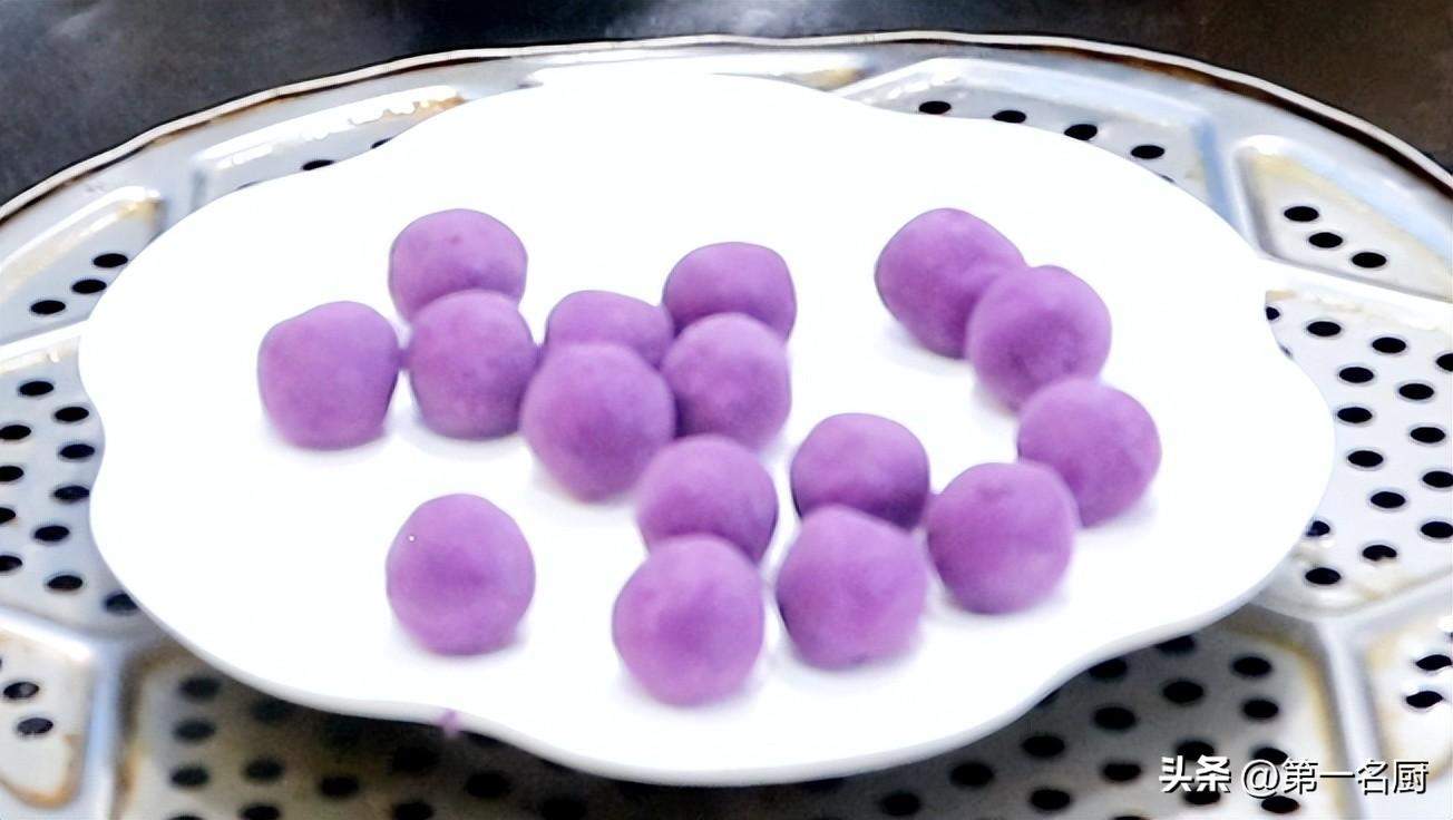 3,蒸好的紫薯里面,加入适量的糯米粉,用手揉成软硬适中的面团,再搓成圆形的丸子,放入盘中。