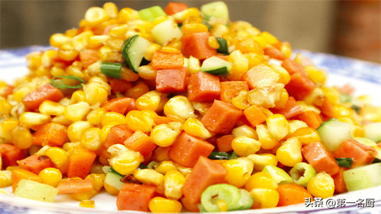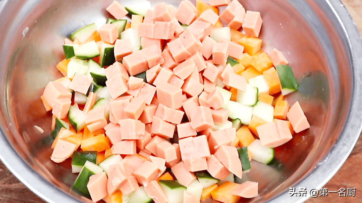 1.准备一棒子玉米,剥成玉米粒备用,胡萝卜,黄瓜,火腿肠各半个,分别切成丁放入盆中备用。