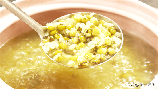 2.砂锅里添入适量的清水,分别倒入绿豆和大米,开大火煮开,改小火继续煮20分钟,