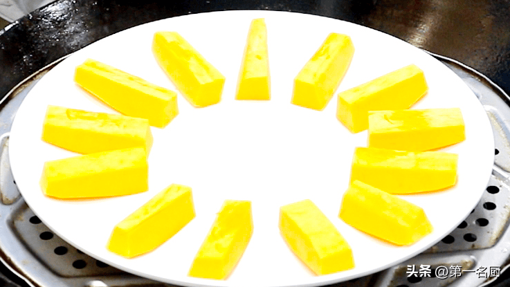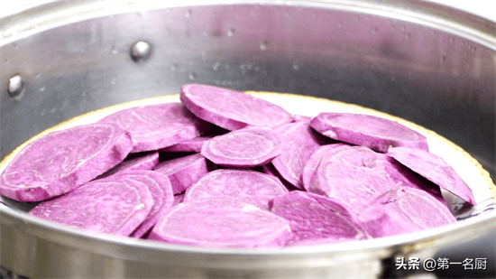 4,15分钟后,取出蒸好的南瓜,控去多余的汁水,再用筷子依次摆好备用,蒸锅中再放入做好的紫薯丸,蒸5分钟,即可取出。