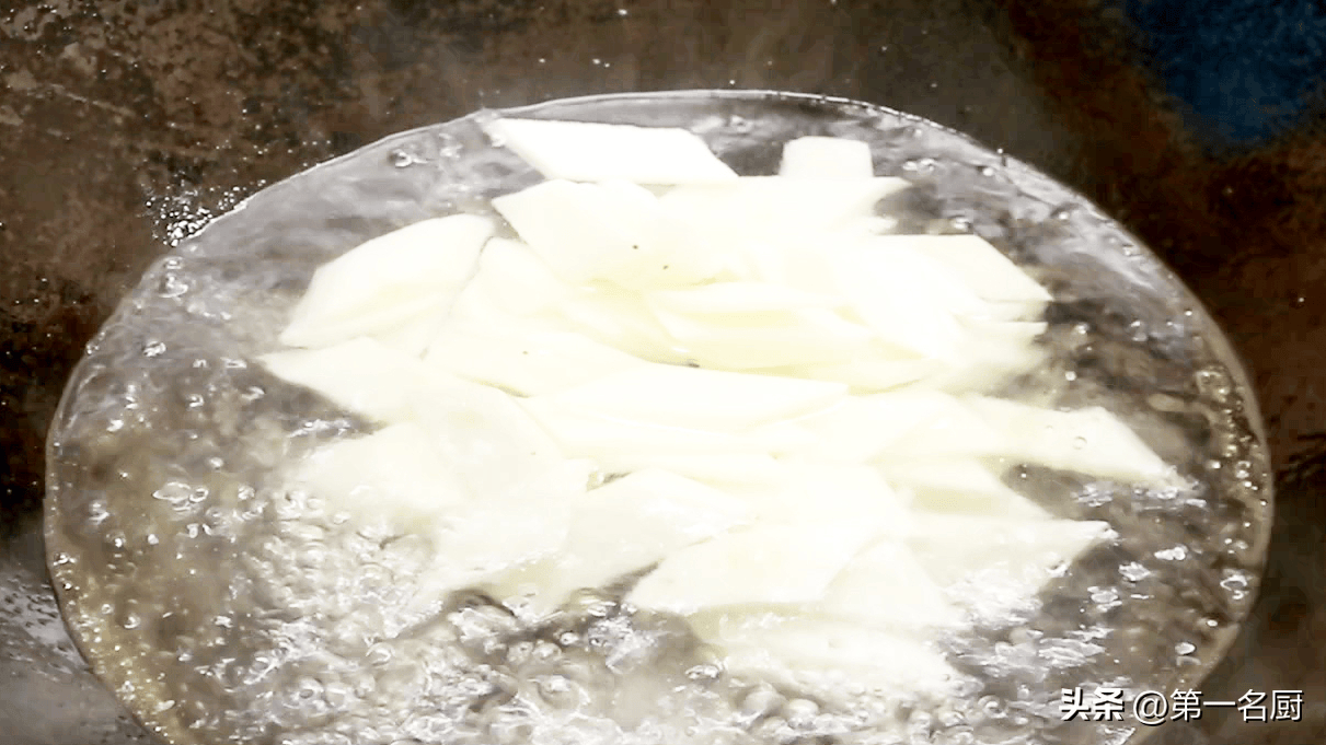 2,锅中添入适量的清水,加入少许植物油,再加入半勺白醋,防止山药氧化变黑,水开后下入山药片,焯水30秒左右,倒入青红椒和木耳,继续焯水30秒,捞出控水放入盘中。