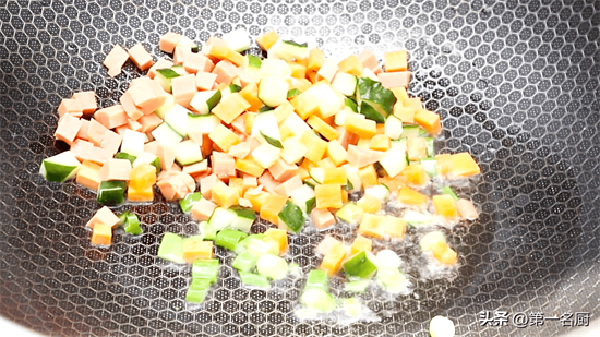 3.重新起锅加入少许食用油,放入葱花爆香,倒入胡萝卜,黄瓜和火腿肠,翻炒几下,把食材炒至断生。