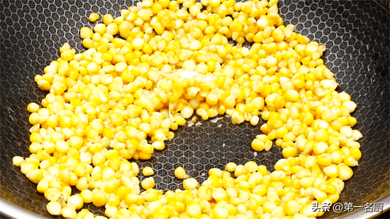 2.炒锅烧热,加入一勺食用油,放入提前剥好的玉米粒,翻炒几下,炒干里面的水汽,加入少许食盐增加底味,翻炒均匀,玉米炒香后,盛入小盆备用。