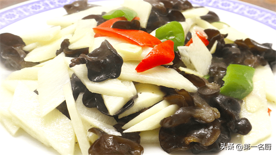 1,准备淮山药半根,削去外皮,切成菱形片,放入盆中备用,一把木耳提前用温水泡开,