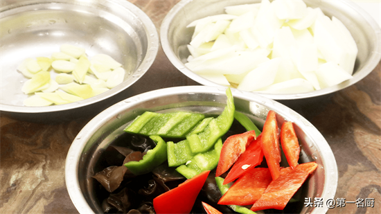 青椒半个切成菱形片,红椒半个同样切成片,用来配色,大蒜几个切成蒜片,生姜切成姜片,一起放入盆中。
