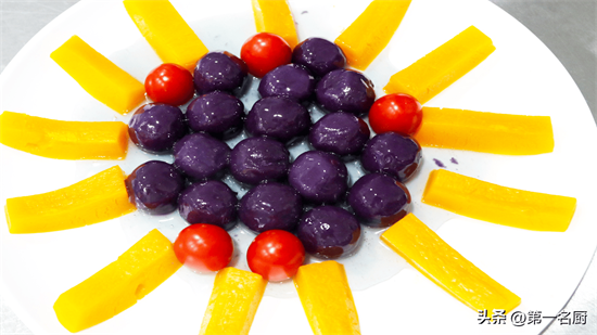 最后把紫薯丸盛到盘子中间,放上几个圣女果用来点缀,这道简单美味的南瓜紫薯丸就做好了。