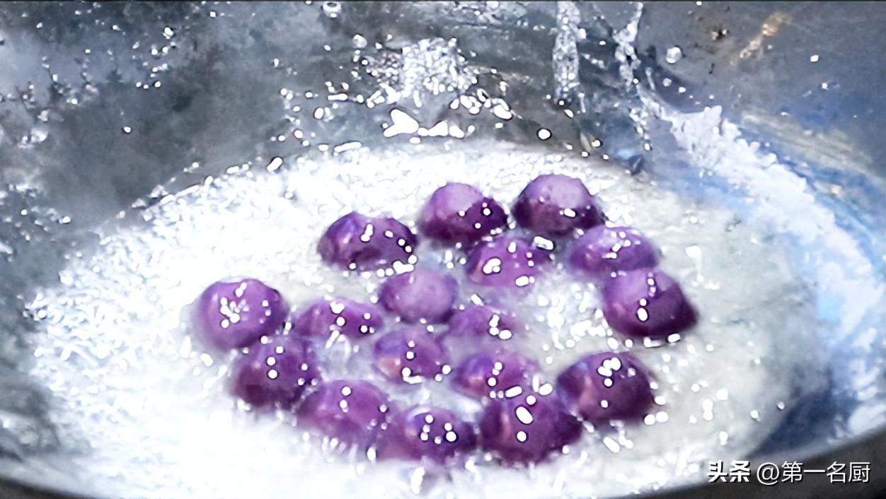 6,下入蒸好的紫薯丸,用勺子不停的翻动,使紫薯丸均匀的裹上汤汁,半分钟后关火,