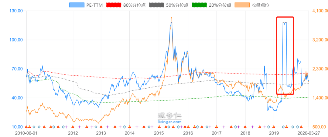 这种业绩下滑导致的PE高估的情况,不能反映指数的真实估值水平。因此,遇到异常情况,可以使用等权PB或者PE中位数来作为暂时的替代估值指标。