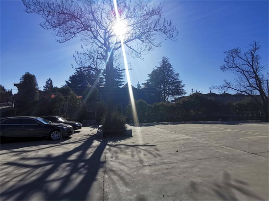 天气特别的好,阳光明媚。天空蓝的发紫,树木沐浴着温暖的阳光,如镶嵌于蓝色背景的图案。