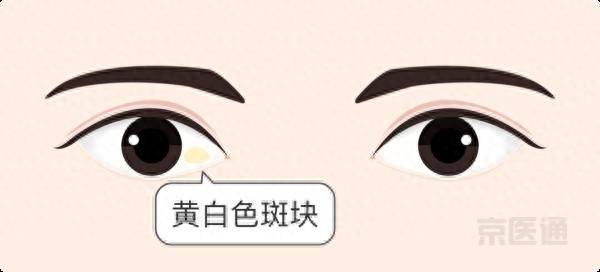 眼白上出现黄白色斑块,轻微隆起,但没有明显不良症状。在医学上称为「睑裂斑」。它是一种良性的结膜病变。