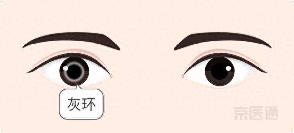 角膜周围出现灰色的光环,俗称「老年环」。通常是高胆固醇和甘油三酯的早期指标异常,也意味着心脏病发作的风险会增加。